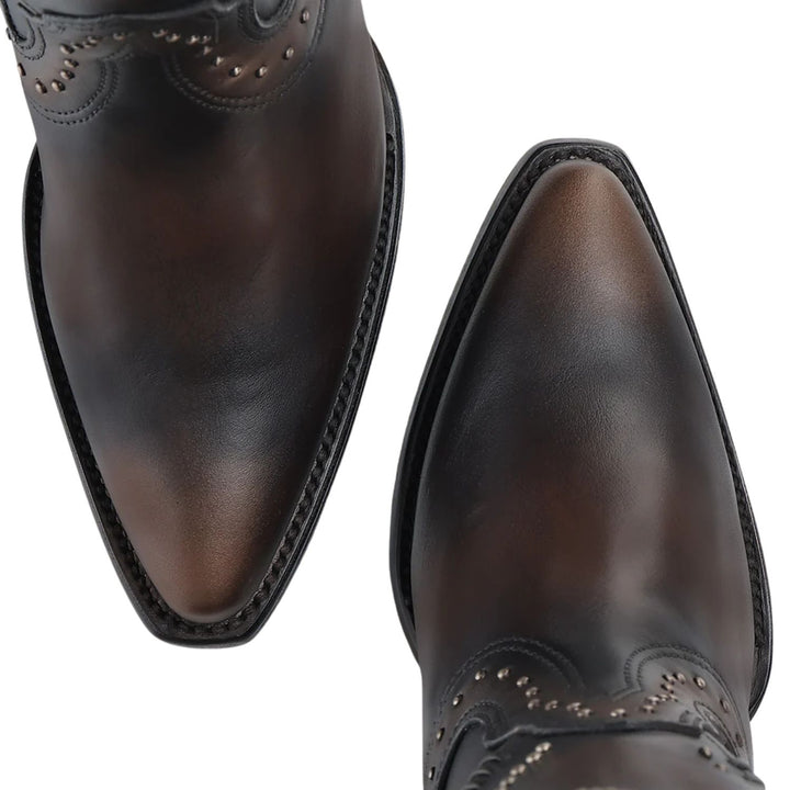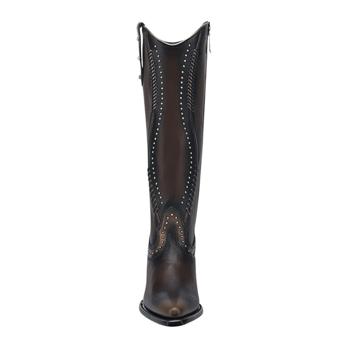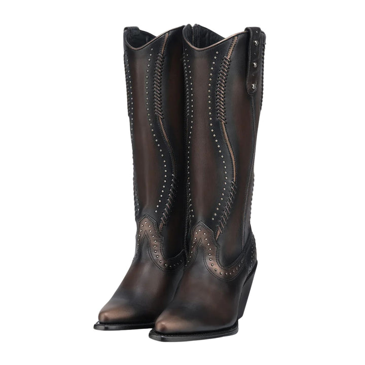 Bota alta para dama elaborada en piel genuina de bovino, con un acabado vintage pintado a mano que refleja exclusividad y carácter único. Su diseño incorpora tejido artesanal y finos herrajes metálicos, además de una oreja lateral decorada con aplicaciones metálicas que realzan su estética sofisticada y distintiva.