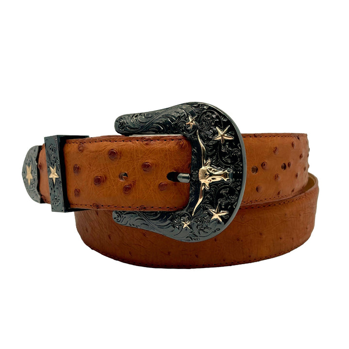 El Cinturón de Avestruz Cognac combina lujo, autenticidad y estilo vaquero en una sola pieza. Confeccionado en piel genuina de avestruz y acabado en un tono coñac cálido, es ideal para quienes buscan un accesorio distintivo y duradero.