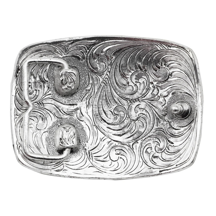 La Hebilla AndWest Longhorn Gold 761 es una pieza que rinde homenaje al espíritu del Viejo Oeste, con un diseño imponente y elegante. En su centro resalta la figura del longhorn dorado, símbolo de fuerza y tradición vaquera, sobre un fondo de grabados florales en tono plateado brillante.