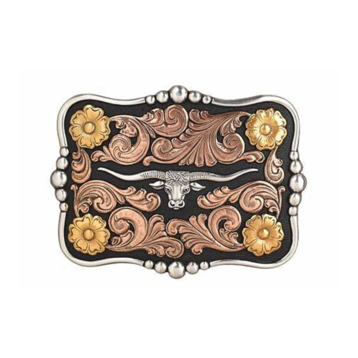 La Hebilla Nocona Longhorn 37917 combina el espíritu del Viejo Oeste con un diseño elegante y detallado. Fabricada en metal de alta calidad, presenta una figura central del icónico toro Longhorn sobre un fondo grabado con delicados relieves. Su acabado en tonos plateados y dorados realza su carácter distintivo, convirtiéndola en el accesorio perfecto para cualquier cinturón western.