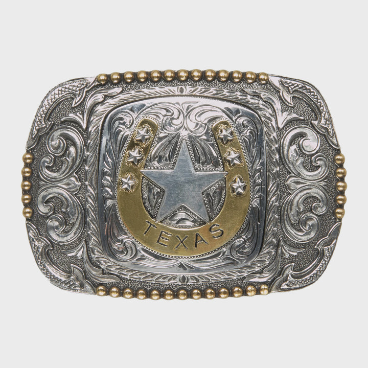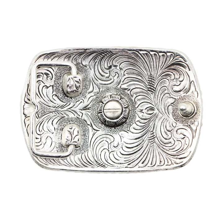 La Hebilla AndWest Texas Scrolled Rectangle RC010 combina diseño clásico y elegancia western en una pieza rectangular con esquinas redondeadas. Presenta grabados detallados de motivos florales y arabescos, enmarcando una figura central de Texas, símbolo del orgullo y la tradición tejana.