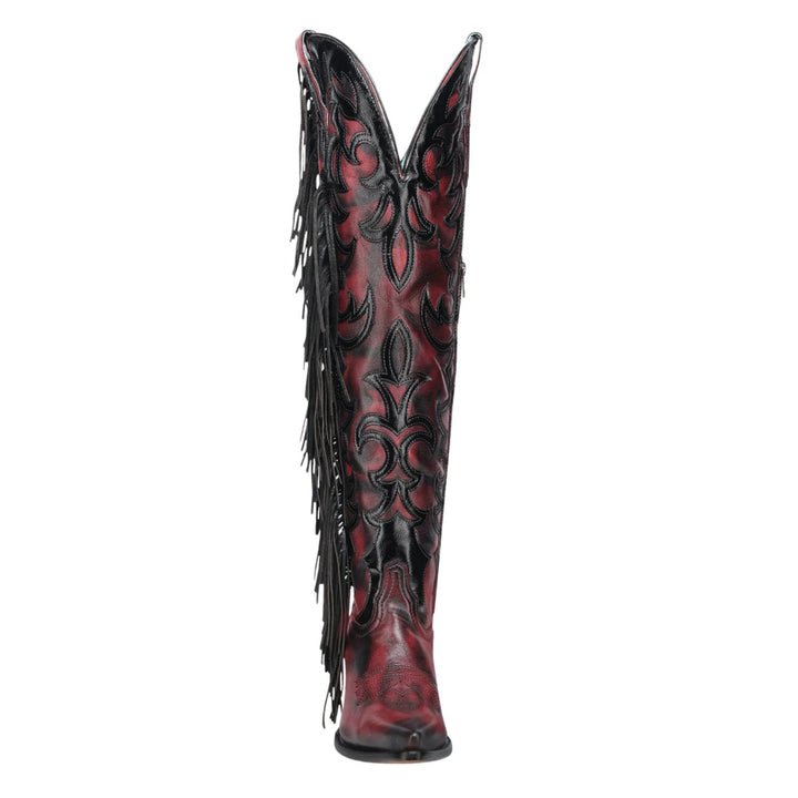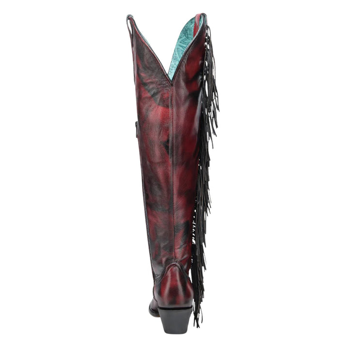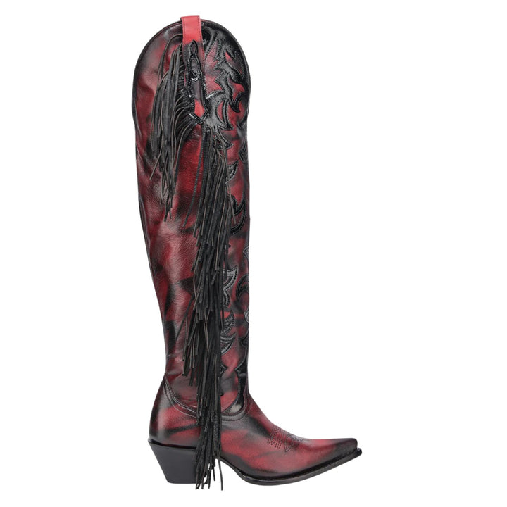 Las Corral Z5453 son botas femeninas que combinan la elegancia tradicional del vaquero con un diseño llamativo y femenino. Confeccionadas en piel (lamb leather), presentan un bordado rojo sobre superposición y flecos que le dan un carácter único y lleno de movimiento. Su silueta alta añade presencia, mientras que la puntera puntiaguda (pointed) y el tacón de 2″ realzan su perfil vaquero clásico.