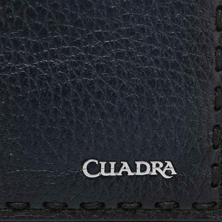 En el interior, presenta un grabado del logotipo Cuadra, junto con una distribución práctica que incluye ocho espacios para tarjetas y dos compartimentos para efectivo, ofreciendo organización y funcionalidad en cada uso.